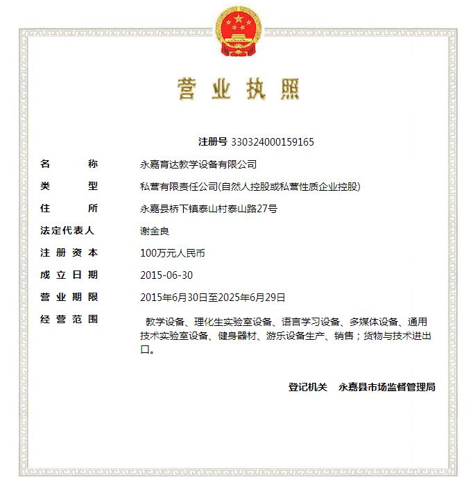 永嘉育达:是定做教学设备、理化生实验室设备、语言学习设备、多媒体设备、通用技术实验室设备、健身器材、游乐设备生产厂家、质量保证、实用性强、定做工期快的优点、客户的满意是育达的心愿